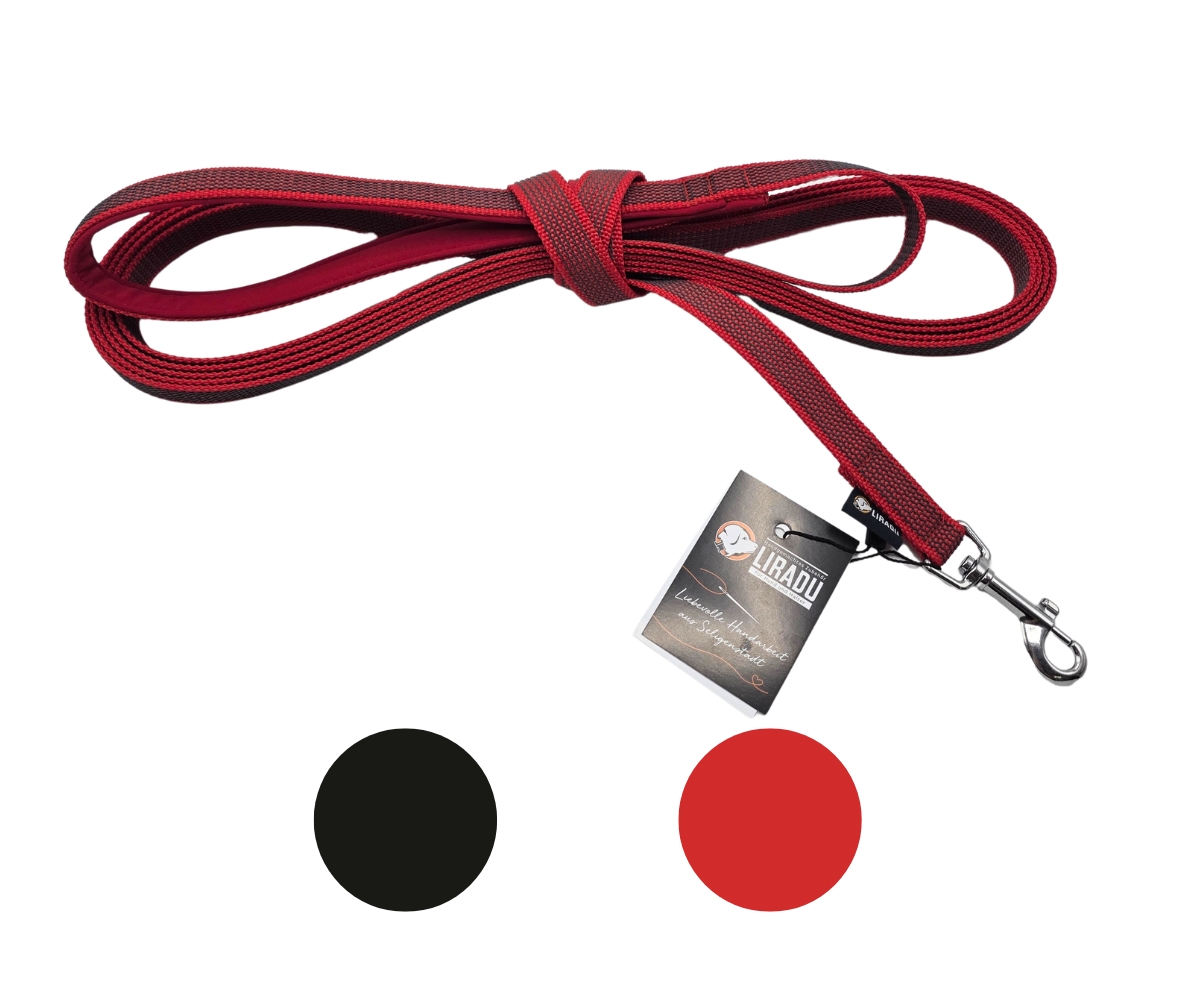 Die Leine endet in einer fest vernähten, mit Softshell gepolsterten Handschlaufe. Sie liegt angenehm in der Hand und ist für die aktive Führung gedacht – nicht zum Schleifen über den Boden.